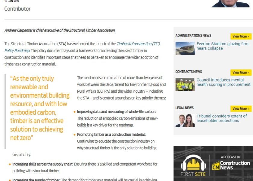 The STA has welcomed the launch of the Timber in Construction (TiC) Policy Roadmap. The policy document lays out a framework for increasing the use of timber in construction and identifies important steps that need to be taken to encourage the wider adoption of timber as a construction material.