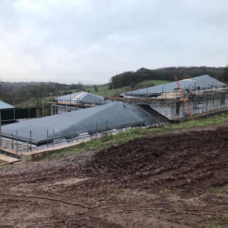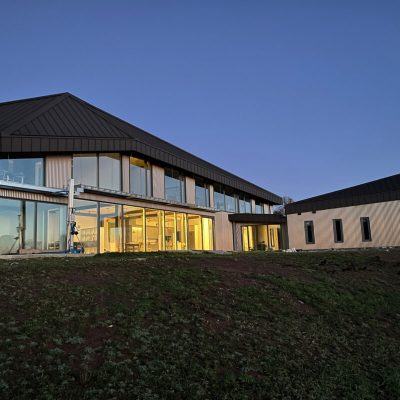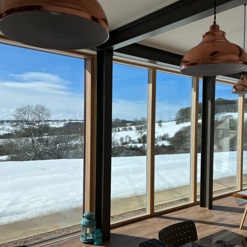 2 existing barns were knocked down.  Foundations laid and 45tonnes of steel formed the frame of the building.  The entire structure was then clad in SIPs.  Walls clad in corrugated steel and standing seem roof all encased with triple glazed aluminium windows and doors.