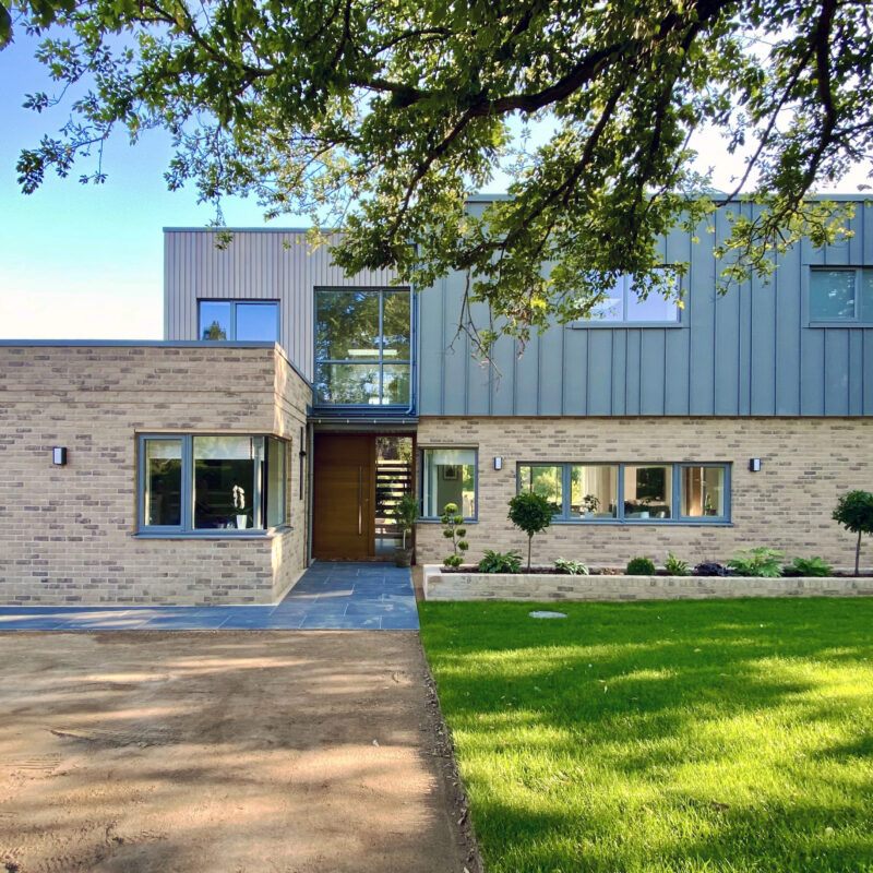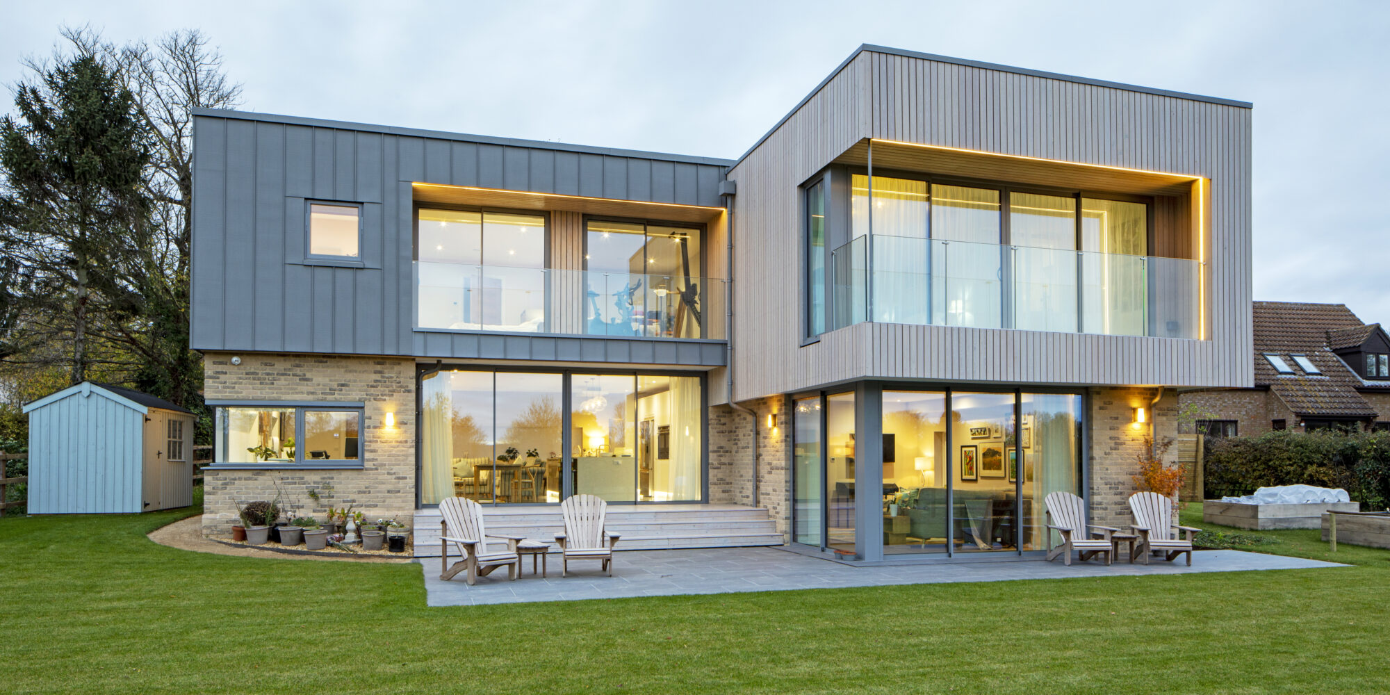 Showcasing the flexibility of timber frame, the home features three complimentary external finishes: brick, timber and standing-seam zinc, and of course wide and tall glazed openings to make the best of those south views, with solar gain carefully managed by the overhangs.